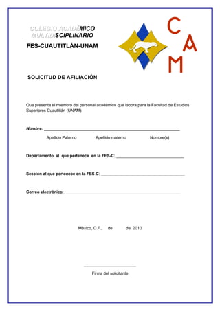 Este documento es una solicitud de afiliación al Colegio Académico Multidisciplinario de la Facultad de Estudios Superiores Cuautitlán de la UNAM. Contiene espacios para que el solicitante escriba su nombre completo, el departamento y sección a la que pertenece en la FES-C, su correo electrónico y firma, con el fin de iniciar el proceso de afiliación al colegio académico.