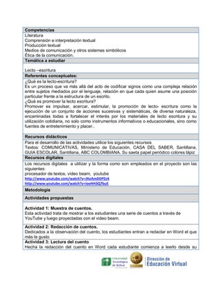 Este proyecto busca mejorar la lectoescritura en estudiantes de primer grado a través de actividades lúdicas con tecnología. Se presentarán cuentos en YouTube y se proyectarán, luego los estudiantes redactarán sus cuentos favoritos en Word y finalmente los leerán. El proyecto evaluará la capacidad de lectura y escritura de los estudiantes mediante pruebas y observación directa, con el fin de cultivar el gusto por la lectoescritura.