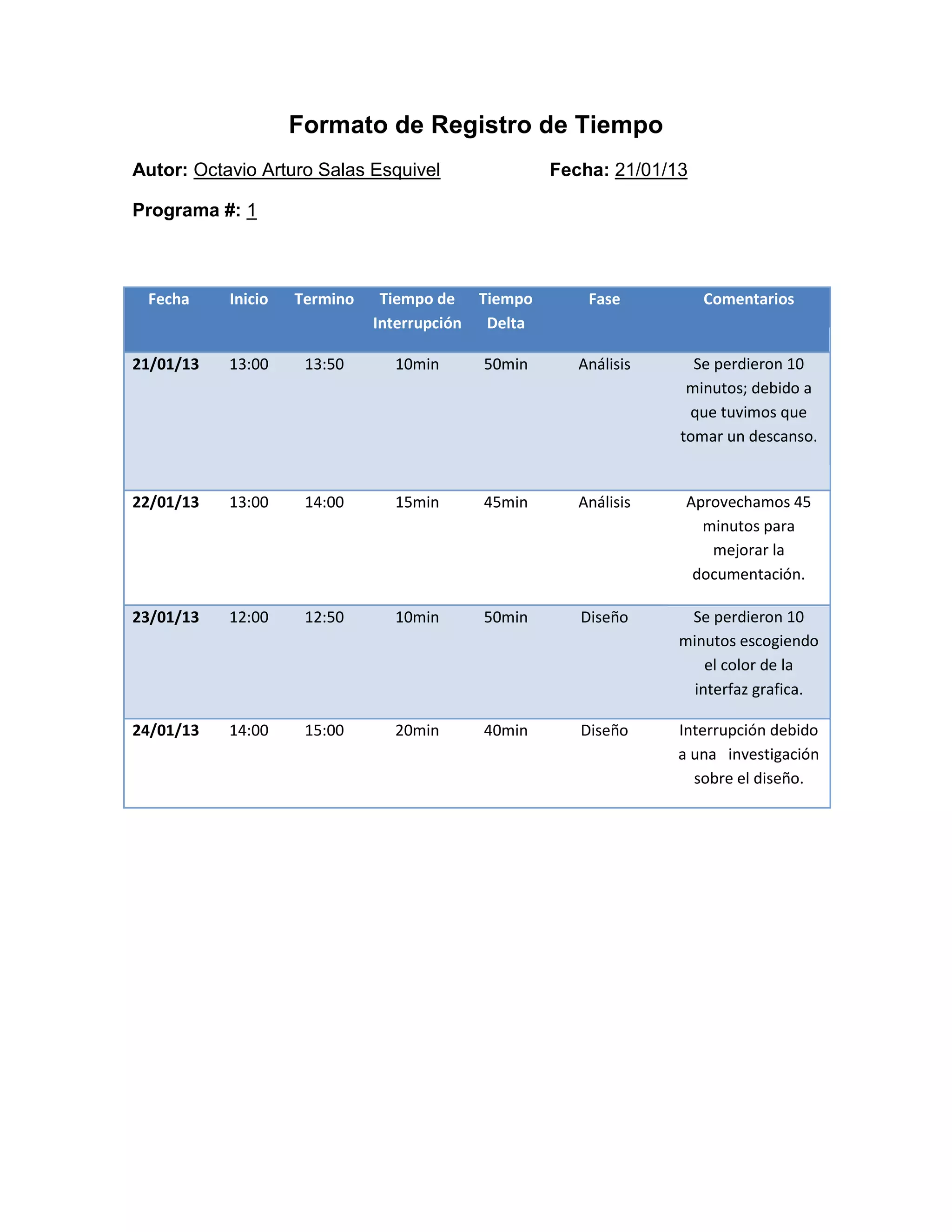 Este documento presenta los formatos de registro de tiempo y defectos para dos programas desarrollados por estudiantes. Incluye tablas que muestran el tiempo invertido y las interrupciones durante las diferentes fases de desarrollo, así como los defectos encontrados, su tipo y tiempo de corrección. También presenta un resumen del plan de uno de los proyectos indicando el tiempo planeado vs real para cada fase y los defectos encontrados.
