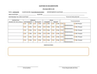 Este documento presenta un formato de auditoría de documentación a nivel de software y hardware. Incluye tres formatos de auditoría para software, telecomunicaciones, hosts y terminales de usuario. Cada formato solicita información sobre manuales, licencias, funcionamiento y mantenimiento de la aplicación, dispositivo o equipo auditado. El propósito es verificar el cumplimiento de la documentación y estado técnico requerido.