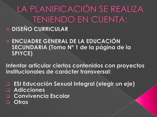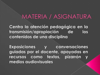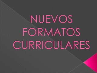 Este documento describe diferentes formatos curriculares como seminarios, talleres, proyectos, laboratorios y trabajos de campo que se pueden utilizar para abordar los contenidos de las asignaturas. Explica brevemente cada formato y da ejemplos de cómo podrían aplicarse en diferentes materias. También menciona que los estudiantes deben tener diferentes ritmos de aprendizaje y que los módulos flexibles pueden adaptarse mejor a sus necesidades individuales.