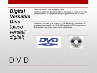 Este documento contiene información sobre diferentes formatos de almacenamiento de audio y video digitales como DVD, VCD, AVI, DIVX, Blu-Ray, MPEG, MP3, MP4, QuickTime entre otros. Explica características como su capacidad de almacenamiento, cuando y por quien fue creado cada formato. También incluye enlaces a Wikipedia y Google Images.