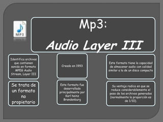 El formato Mp3 almacena audio con calidad de CD de forma compacta, reduciendo el tamaño de los archivos a 1/10. MP4 es un contenedor para video y audio MPEG-4 que también puede almacenar subtítulos e imágenes. MPEG es un estándor para video digital utilizado en DVDs, cable y satélite. AVI es el formato estándar de Windows para video mientras que MOV es el formato de Apple para multimedia.