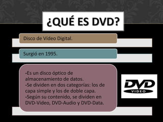 Este documento define y explica brevemente varios formatos de video y audio digitales como DVD, Video-CD, AVI, DivX, MP3, MPEG, MOV, MP4 y Blu-ray. Explica que DVD es un disco óptico de almacenamiento de datos dividido en capas, Video-CD almacena video, AVI almacena audio y video simultáneamente, y MP3 es un formato de compresión de audio con pérdida.
