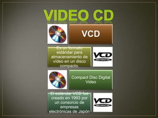 El documento habla sobre diferentes formatos de almacenamiento de audio y video. Menciona formatos como VCD, DVD, Blu-ray, MP3, Mp4, AVI, entre otros. Explica brevemente el propósito, especificaciones y orígenes de cada uno de estos formatos.