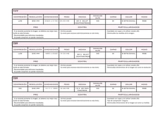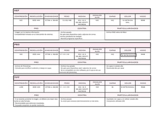 El documento compara diferentes formatos de archivo de imagen (NEF, PSD, TIFF, JPEG, GIF y PNG) en términos de compresión, resolución, dimensiones, peso, canales alfa, capas, modo de color y otras características. Se muestran varias configuraciones para cada formato con diferentes valores para estos parámetros y se resumen sus ventajas e inconvenientes.
