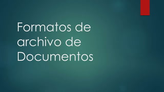 Este documento describe diferentes formatos de archivos de documentos digitales. Explica que un archivo digital tiene un nombre y una extensión que indica su formato. Luego describe formatos comunes como .txt para archivos de texto, .ppt para presentaciones de PowerPoint, .doc para documentos de Microsoft Word, .pdf para archivos portátiles y cómo cada uno puede ser abierto por software específico.