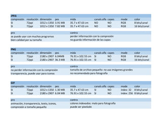El documento compara los formatos de archivo PSD, RAW, TIFF, JPEG, PNG y GIF para imágenes. PSD es un formato de archivo de Photoshop sin compresión que permite capas y edición, pero requiere Photoshop. RAW contiene la máxima información de la imagen pero requiere una cámara específica. TIFF permite edición de capas sin pérdida de información pero los archivos pueden ser pesados. JPEG es popular debido a su buena calidad y tamaño pequeño pero descarta información. PNG es adecuado para icon