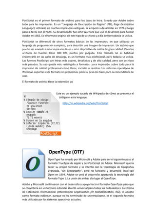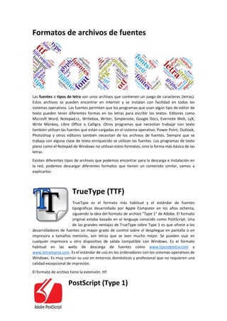 El documento describe diferentes formatos de archivos de fuentes, incluyendo Truetype, Postscript y Opentype, destacando su utilidad en programas de texto enriquecido y su compatibilidad con varios sistemas operativos. Truetype es el formato más común para uso general, mientras que Postscript es más profesional y de alta calidad, y Opentype es una colaboración entre Microsoft y Adobe. Todos los formatos son compatibles entre sí y funcionan en sistemas operativos como Windows, Mac y Linux.