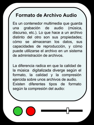 Este documento describe diferentes formatos de audio digitales, incluyendo sus características, usos y desarrollos. Algunos formatos populares son WAV (sin compresión), MP3 (compresión con pérdida pero alta calidad), AAC (más eficiente que MP3), y MIDI (representa música pero no almacena muestras de sonido). Otros formatos discutidos incluyen Ogg, AIFF, RIFF, MOD y formatos para streaming como RealAudio.