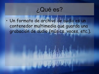 Este documento describe los principales formatos de audio digital, incluyendo WAV (sin compresión), AAC, WMA, OGG y MP3 (todos con compresión). Explica que un formato de audio es un contenedor que almacena grabaciones de sonido y cada formato tiene diferentes características de compresión, calidad de sonido y uso común.