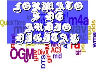 Los archivos de audio digital se pueden guardar en diferentes formatos, cada uno con una extensión específica. Los formatos sin comprimir como WAV y AIFF son de gran tamaño y se usan para audio profesional, mientras que los formatos comprimidos como MP3, OGG y AAC reducen el tamaño hasta 10 veces con apenas pérdida de calidad, aprovechando que el oído humano no distingue bien frecuencias muy juntas.