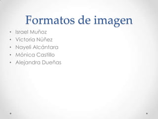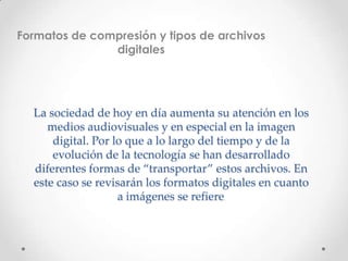 Este documento describe diferentes formatos de archivos de imagen digitales, incluyendo sus siglas, programas de soporte, aplicaciones y características técnicas. Formatos como BMP, EPS, GIF, JPG, PNG y TIFF se utilizan comúnmente para fotografías e imágenes en editores de imagen, navegadores web y cámaras digitales. Cada formato tiene ventajas y limitaciones dependiendo del tipo de contenido de imagen y uso previsto.