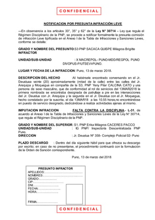 Cuatro documentos notifican a cinco policías de Puno sobre presuntas infracciones leves cometidas el 13 y 23 de marzo de 2018 por no cumplir con sus funciones asignadas. Se les informa sobre la descripción de los hechos, la imputación de la infracción, el plazo para presentar su descargo y el procedimiento a seguir si no se presentan.