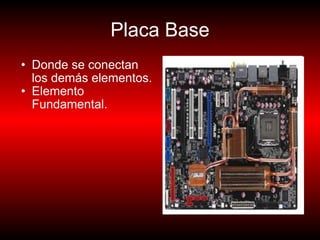 La placa base es el elemento fundamental donde se conectan los demás componentes de una computadora. Existen diferentes formatos de placas base como AT, Baby AT, ATX y LPX, cada uno con características de diseño y conectores específicos. Las placas base se fabrican para adaptarse a los formatos estándar o a formatos propietarios de ciertas marcas.