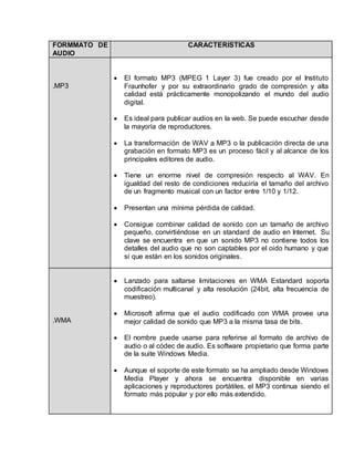 El documento describe los formatos de audio y video más comunes, incluyendo sus características principales. Para el audio, explica que el formato MP3 es el estándar debido a su alta compresión y calidad de sonido, mientras que formatos como WAV son de mayor calidad pero también de mayor tamaño. Para el video, señala que formatos como MP4, WMV, FLV y MOV son ideales para publicar en la web debido a su buena relación de calidad y tamaño de archivo.
