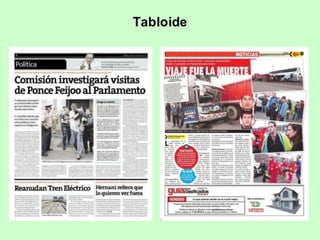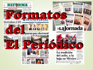 Un periódico es una publicación impresa con noticias que se publica diaria o semanalmente. Existen 4 formatos principales: sábana, tabloide, Berliner y arrevistado. Los más comunes son el formato sábana y tabloide. El formato tabloide es más pequeño y práctico, mientras que el formato sábana se considera más serio. La estructura externa de un periódico incluye su formato, número de columnas y organización del contenido.