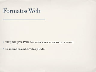 El documento describe diferentes formatos digitales para imágenes, video, audio y texto. Explica que los formatos TIFF, GIF, JPG, PNG no son todos adecuados para la web, y que la elección de formato depende del tipo de contenido y su uso previsto. También define conceptos clave como píxeles, resolución, profundidad de color y tamaño de archivo en relación a las imágenes digitales.
