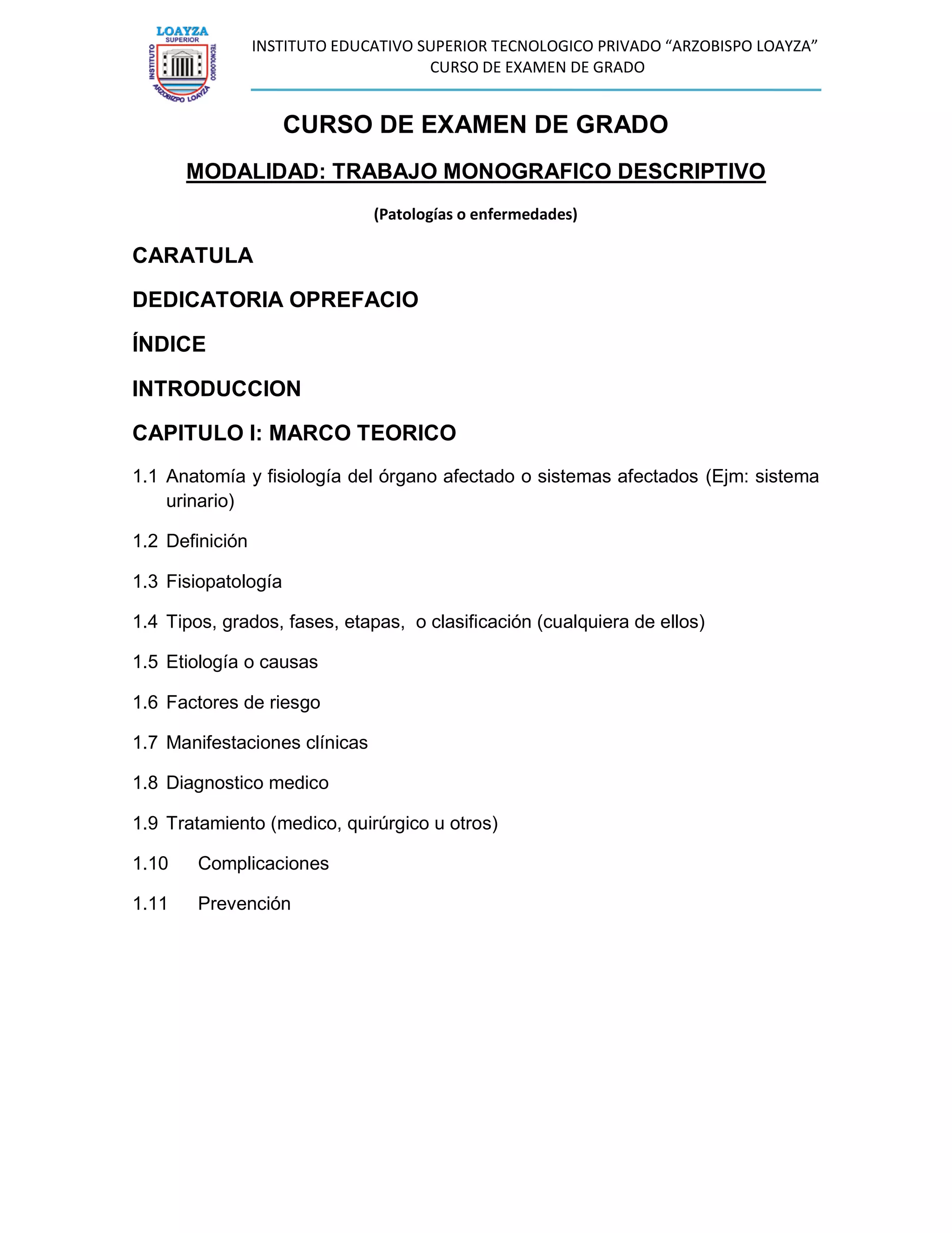 Este documento presenta las pautas y el formato requerido para la elaboración de un trabajo monográfico descriptivo sobre patologías o enfermedades como requisito para el examen de grado de un instituto educativo superior tecnológico privado. El trabajo deberá incluir una introducción, dos capítulos principales sobre el marco teórico de la enfermedad y el rol de enfermería, y una sección de conclusiones y recomendaciones. Además, se especifican detalles de formato como tipo y tamaño de letra, má