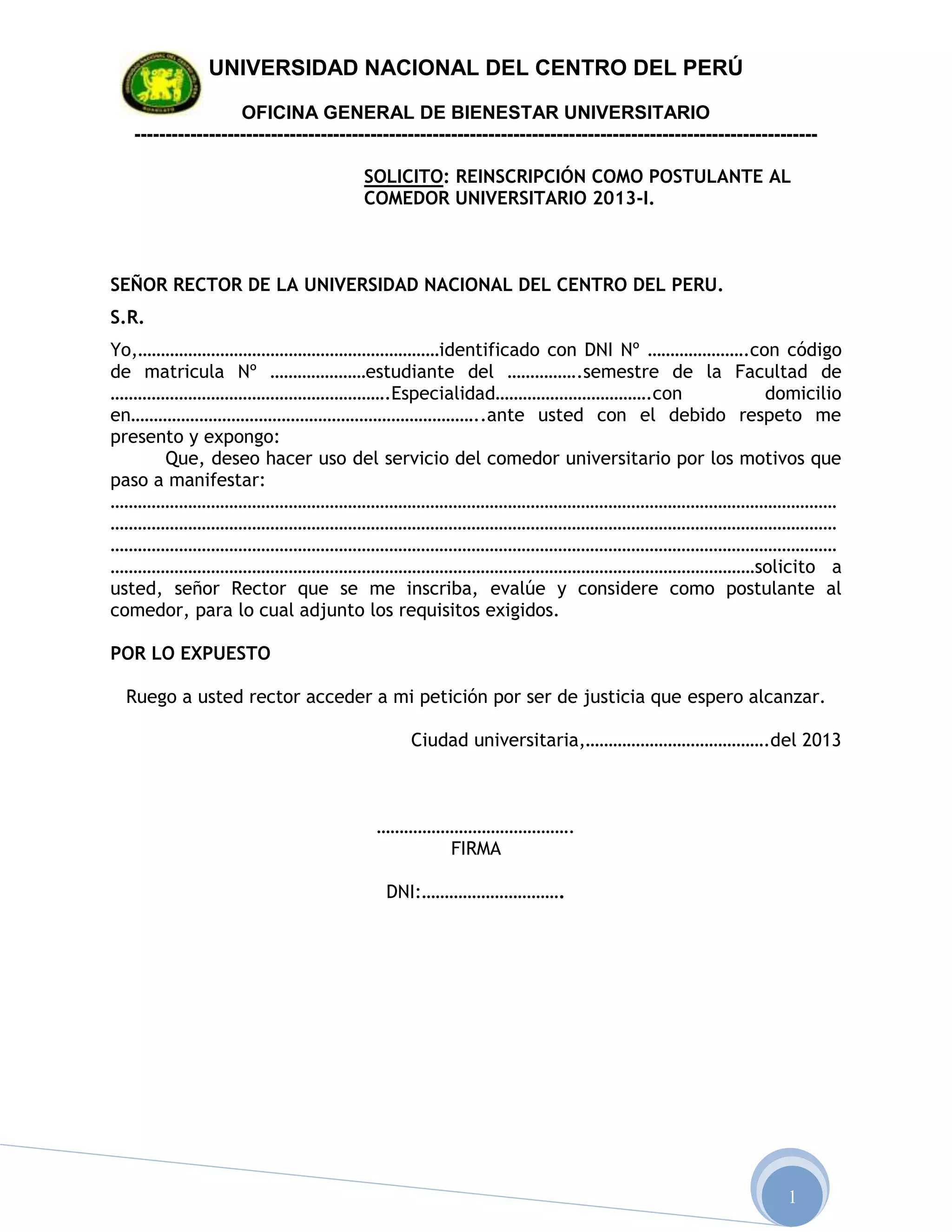 El estudiante solicita ser inscrito como postulante al comedor universitario para el semestre 2013-I, adjuntando los requisitos exigidos. Firma una declaración jurada en la que declara que los datos en su ficha socioeconómica son verdaderos y acepta someterse a sanciones en caso de falsedad.