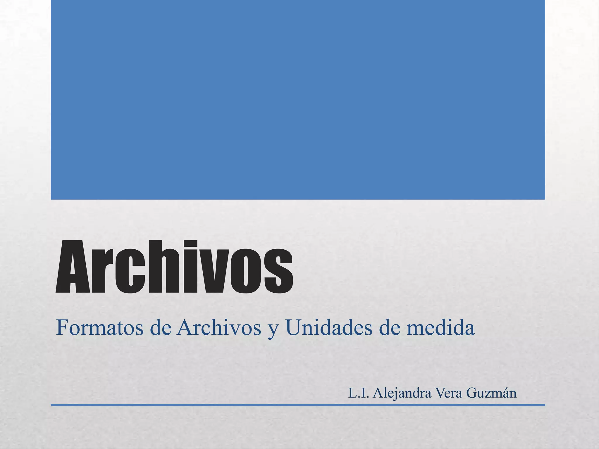 El documento describe los tipos de archivos, extensiones de archivos y formatos comunes. Las extensiones de tres letras indican el tipo de archivo y programa para abrirlo. Los tipos de archivos incluyen audio, video, imágenes y archivos comprimidos. También menciona las unidades de medida de almacenamiento de archivos.