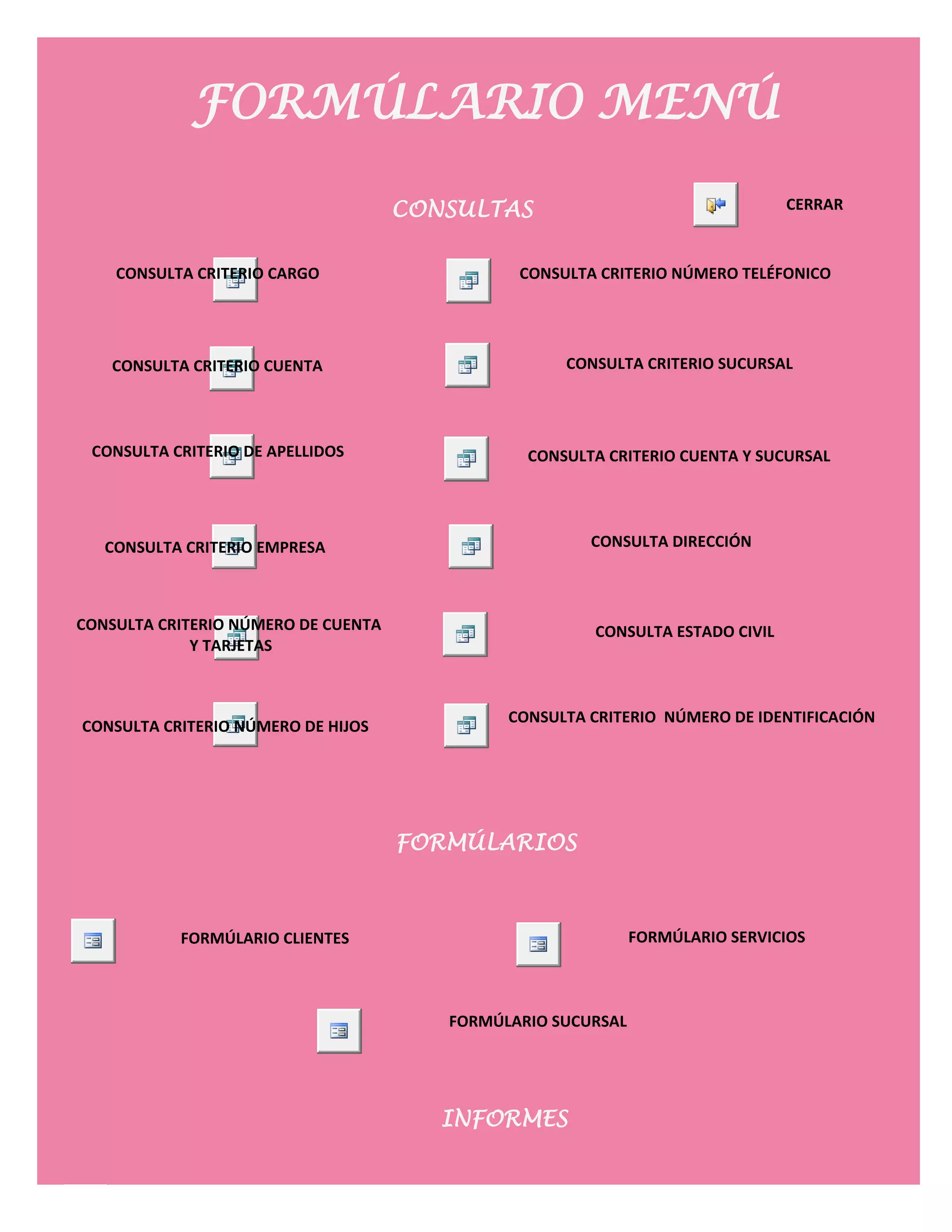 Este documento presenta un menú de opciones para realizar consultas y generar informes y formularios sobre clientes, cuentas, sucursales y otros criterios como número de teléfono, apellidos, empresa, dirección, número de cuenta, estado civil, número de identificación y número de hijos. El menú permite seleccionar diferentes opciones para buscar y ver información específica.