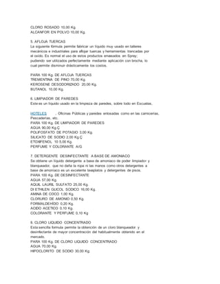 Este documento proporciona 25 fórmulas para producir una variedad de productos químicos, incluyendo anticorrosivos, detergentes, limpiadores, repelentes de insectos y más. Cada fórmula lista los ingredientes necesarios para producir 100 kg del producto y sus porcentajes por peso. Los ingredientes incluyen agua, diversos químicos como ácidos, bases y solventes, y en algunos casos colorantes y perfumes.