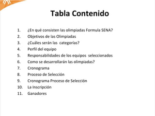 Las olimpiadas Formula SENA son un proyecto para desarrollar un vehículo de carrera monoplaza que promueve la creatividad, el liderazgo y competencias técnicas en equipos interdisciplinarios de aprendices, instructores y estudiantes. Los equipos diseñarán, validarán y construirán un prototipo que será evaluado en pruebas. El cronograma incluye la inscripción de equipos, la selección de anteproyectos, la ejecución de los proyectos seleccionados y las evaluaciones finales.