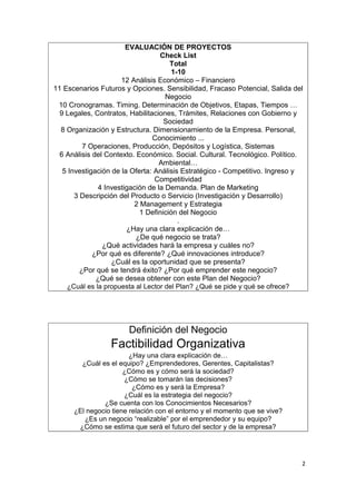1) El documento presenta un análisis de la factibilidad de proyectos, explicando las variables clave a considerar como la definición del negocio, factibilidad organizativa, comercial, técnica, ambiental, legal y económico-financiera. 2) Se describen estas variables en detalle incluyendo aspectos como el producto, marketing, competencia, operaciones, sistemas y modelo financiero. 3) El documento provee una guía completa para evaluar la factibilidad de un plan de negocios.