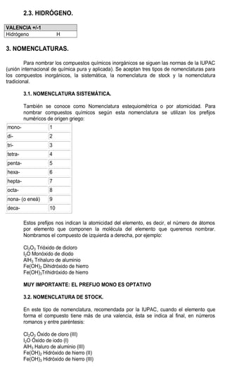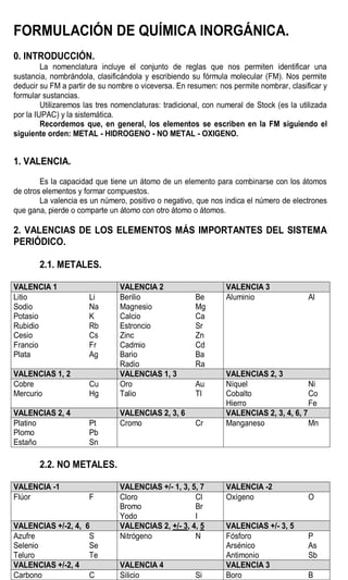 Este documento presenta información sobre la nomenclatura y formulación de compuestos inorgánicos. Introduce tres tipos de nomenclatura (sistemática, de Stock y tradicional) y explica conceptos como valencia y tipos de compuestos binarios como óxidos, hidruros metálicos y de no metales. También incluye tablas detallando las valencias de los elementos y ejemplos de cómo nombrar diversos compuestos inorgánicos según las diferentes nomenclaturas.