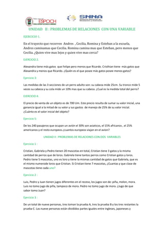 Este documento presenta una serie de ejercicios de matemáticas relacionados con problemas de una y dos variables. Incluye cinco ejercicios en cada una de las siguientes unidades: problemas de relaciones con una variable, problemas de relaciones con dos variables, problemas relativos a eventos dinámicos y problemas por búsqueda exhaustiva. Cada ejercicio describe un problema matemático y pide determinar cierta información basada en los datos proporcionados.