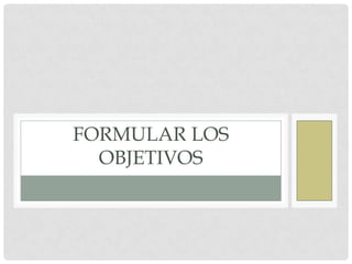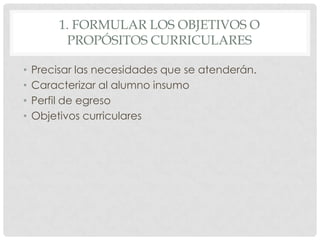 El documento describe los pasos para formular los objetivos de un currículo escolar. Primero, se deben precisar las necesidades educativas que se atenderán mediante la caracterización del alumnado y la definición de un perfil de egreso. Luego, se jerarquizan y cuantifican dichas necesidades. Finalmente, se establecen objetivos curriculares específicos que guiarán las actividades de enseñanza-aprendizaje.