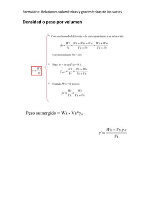 Este documento define los símbolos utilizados para representar los volúmenes y pesos de las fases sólida, líquida y gaseosa de una muestra de suelo. Explica las relaciones volumétricas y gravimétricas entre estas fases, incluyendo el volumen total, volumen de vacíos, densidad, contenido de humedad, grado de saturación y grado de aireación.