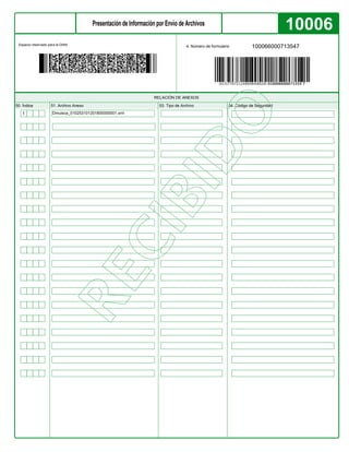 Este documento contiene información sobre una transacción, incluyendo los números de identificación del remitente, destinatario e interesado. También incluye detalles como el tipo y nombre de archivo anexo, fecha de la transacción, y un índice asignado al anexo.