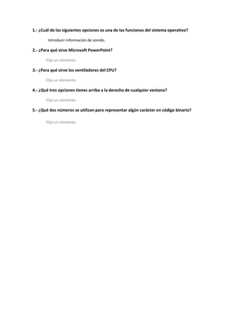 Este documento contiene 5 preguntas de opción múltiple sobre funciones de sistemas operativos, usos de Microsoft PowerPoint, propósito de ventiladores de CPU y elementos comunes en ventanas. Proporciona información básica sobre hardware, software y interfaces gráficas de computadoras.