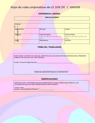 Este documento es la hoja de vida de LE SON DE L'AMOUR, que incluye información personal como nombre, fecha y lugar de nacimiento, educación y experiencia laboral. Detalla la formación académica de LE SON DE L'AMOUR incluyendo títulos obtenidos y fechas de grado en educación básica y superior. También proporciona detalles del empleo anterior de LE SON DE L'AMOUR como empresa, departamento, fecha de ingreso y cargo.