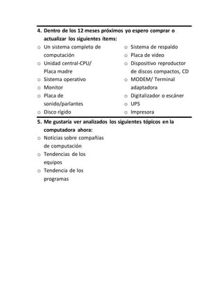 La encuesta solicita información a los suscriptores sobre su uso de computadoras en el trabajo y el hogar, el software que usan, y artículos tecnológicos que pueden comprar o actualizar. También pide sugerencias sobre temas a cubrir en el boletín, como noticias sobre compañías de computación, tendencias de hardware y software.