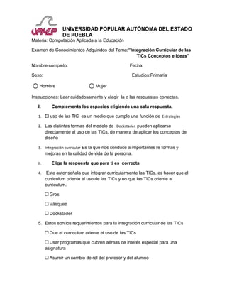 Este documento presenta un examen de conocimientos sobre la integración curricular de las TIC en la educación. El examen contiene 12 preguntas que evalúan conceptos clave como el uso de las TIC como estrategia educativa, los modelos de integración curricular propuestos por autores como Dockstader, y la definición de integración curricular dada por la ANUIES que implica el uso de las TIC como herramientas para estimular el aprendizaje de contenidos.