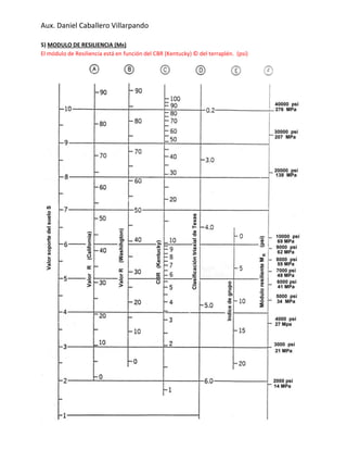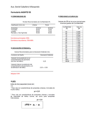 Este documento presenta los pasos para realizar un diseño de pavimento utilizando el formulario AASHTO 93. Explica conceptos como confiabilidad, área bajo la curva, módulo de resiliencia, número estructural, coeficientes estructurales y de drenaje, espesores mínimos y la fórmula para calcular el número estructural. También incluye una tabla con coeficientes estructurales sugeridos por AASHTO para diferentes materiales y condiciones.