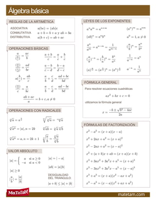 Este documento presenta un resumen de los conceptos básicos de álgebra, incluyendo las reglas de la aritmética como asociativa, conmutativa y distributiva, así como operaciones básicas, exponentes, ecuaciones cuadráticas, raíces, factorización, valor absoluto y desigualdades triangulares.