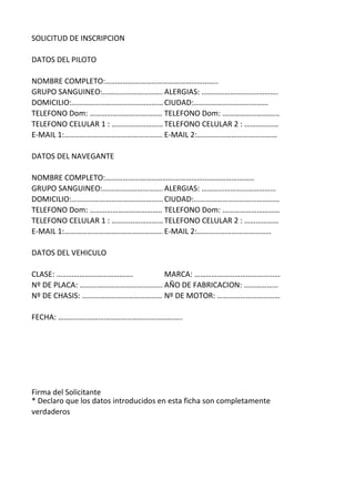 Este documento es una solicitud de inscripción que recopila datos personales del piloto y el navegante, incluyendo nombre completo, grupo sanguíneo, alergias, dirección, teléfonos y correos electrónicos. También recopila datos del vehículo como la clase, marca, número de placa, año de fabricación, número de chasis y motor. El solicitante firma y declara que la información proporcionada es verdadera.