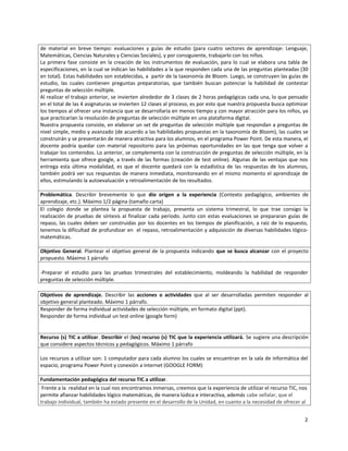Este documento describe un proyecto para optimizar los tiempos de aprendizaje de los estudiantes de 2° básico mediante el uso de las TIC. El proyecto consiste en crear preguntas de selección múltiple en PowerPoint y Google Forms para que los estudiantes practiquen y evalúen sus habilidades matemáticas de manera autónoma. El objetivo es preparar a los estudiantes para las evaluaciones trimestrales y desarrollar habilidades del siglo XXI como definir, buscar y evaluar información. Se espera que al