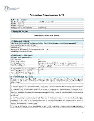 Este proyecto busca introducir el uso de las TIC en el aula para apoyar la enseñanza de los números del 0 al 30 y la comparación de cantidades en estudiantes de primer año básico con riesgo social. Se utilizarán presentaciones interactivas y actividades en Google Docs para motivar a los estudiantes. El objetivo es que los estudiantes puedan reconocer y comparar números, y que valoren el uso de las TIC para apoyar su aprendizaje.