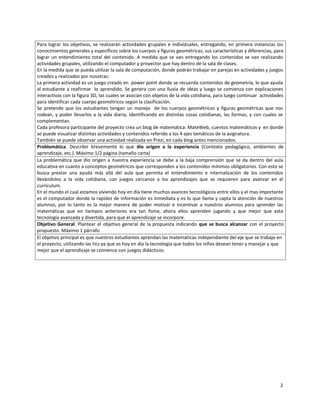 Este documento presenta un proyecto educativo que busca mejorar la comprensión de los estudiantes sobre figuras y cuerpos geométricos a través del uso de tecnologías de la información y comunicación como blogs y juegos didácticos. El proyecto involucra a estudiantes de 3° y 4° básico y utilizará recursos como blogs creados por las profesoras donde se presentarán actividades y contenidos de geometría. El objetivo es que los estudiantes aprendan reconociendo, visualizando y describiendo figuras geométric