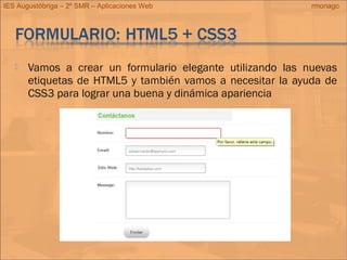 El documento describe cómo crear un formulario elegante utilizando etiquetas HTML5 y CSS3. Se crea un formulario con una clase de estilo dentro de una lista desordenada, con campos como nombre, correo electrónico, sitio web y mensaje. Se agregan estilos a los campos, etiquetas, botón y estados como foco y envío para lograr una apariencia atractiva y dinámica.