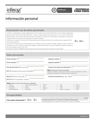 Este documento presenta un formulario de inscripción para estudiantes que presentarán el examen SABER 11. El formulario solicita información personal, académica, socioeconómica y de contacto de los estudiantes. También incluye tablas con opciones de respuesta y explica que los datos serán tratados de acuerdo con la ley para fines del ICFES.