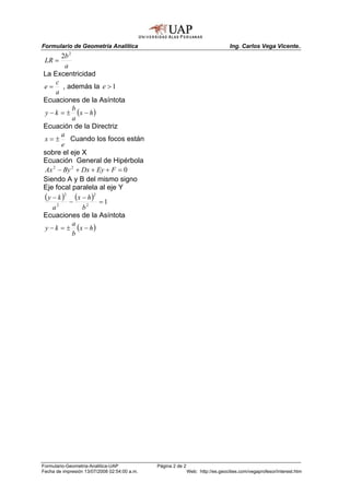 Este documento presenta fórmulas y ecuaciones para describir diferentes figuras geométricas en geometría analítica, incluyendo ecuaciones para rectas, circunferencias, elipses, parábolas e hipérbolas. Explica cómo calcular la pendiente, distancia entre puntos, ecuaciones de directrices y lados rectos. También proporciona detalles sobre cómo describir estas figuras cuando los ejes focales son paralelos al eje x o y.