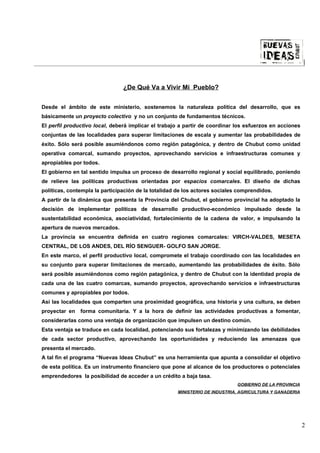 Este documento presenta un formulario para la presentación de proyectos individuales para el programa "Nuevas Ideas Chubut" en Argentina. El formulario solicita información sobre el proyecto, los titulares, la localización, y compromete a los solicitantes a desarrollar el proyecto de manera productiva y sostenible. También incluye secciones sobre la descripción del microemprendimiento, la inversión, y el análisis de mercado.