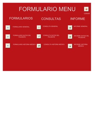 Este documento presenta un menú de opciones para formularios, consultas e informes relacionados con pacientes. Incluye opciones generales y específicas para datos del paciente e historia médica.