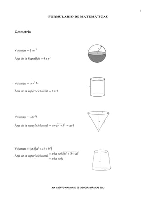 El documento presenta un índice de temas de matemáticas, física y química para un evento nacional de ciencias básicas. Incluye fórmulas y tablas de geometría, trigonometría, números complejos, cinemática, electricidad y magnetismo, así como la serie electroquímica de los metales y tablas periódicas.